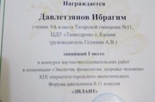 Прошел 19й открытый городской экологический Форум школьников 8-11классов "Зилант". Поздравляем участника, ученика 9 А класса Давлетзянова И., блестяще выступившего в конкурсе в номинации"Экология, физиология, здоровье человека" и занявшего 1место.Молодец! Так держать!
