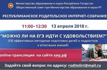 13 апреля состоится заседание Республиканского родительского интернет-собрания. Начало события — 11:00. Завершится заседание в 12:30, полагают организаторы. Наблюдать за ходом собрания, в том числе, можно будет в режиме онлайн-трансляции — на сайте http://киу.рф. Тема пятого заседания родительского интернет-собрания: «Можно ли на экзамены идти с удовольствием?». Модераторами заседания выступят заместитель премьер-министра РТ — министр образования Республики Татарстан Рафис Бурганов и заместитель министра образования и науки Республики Татарстан — руководитель департамента надзора и контроля в сфере образования Министерства образования и науки Республики Татарстан Гульнара Габдрахманова. Эксперты и участники интернет-собрания поговорят об эффективных технологиях интеллектуальной и психологической подготовки выпускников к мероприятиям по итоговой аттестации, о роли родителей и педагогов в успешном преодолении этого непростого периода в жизни подростков. К участию в собрании приглашены специалисты министерств и ведомств, представители школьных родительских комитетов, практикующие педагоги и психологи.