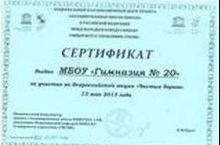 Сертификат участника акции " Чистые берега" 13.06.2013