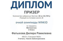 3 нче Б сыйныф укучысы Фатыйхова Диләрә математика фәне буенча WINKID олимпиадасында катнашып, призер исеменә лаек булды. Укытучысы - Зиннурова Наилә Зәйнетдин кызы.