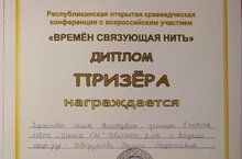 Сегодня в МБОУ «Гимназия 126» Советского района г.Казани прошла Республиканская открытая краеведческая конференция с всероссийским участием «Времен связующая нить». Дипломом призера награждена ученица 9 класса Хусаенова Лейла (научный руководитель Сабирзянова Р.Р.). Поздравляем ее и научного руководителя!