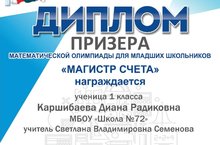 В школе №72 новые достижения! Поздравляем Каршибаеву Диану Радиковну, ученицу 1 класса, и Филиппова Антона Александровича, ученика 1 класса, с дипломом призёра математической олимпиады для младших школьников «Магистр счёта» (учитель Семенова Светлана Владировна).
