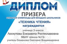 В школе 72 новые достижения! Поздравляем Лоскутову Елизавету Ростиславовну, ученицу 3 класса, и Матюхину Варвару Сергеевну, ученицу 1 класса, с дипломом призёра открытой олимпиады для младших школьников «Техника чтения» (учитель Семенова Светлана Владимировна). Желаем Елизавете и Варваре успехов и побед!