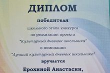 Поздравляем Ерохину Анастасию, ученицу 2 класса, с победой в номинации "Лучший культурный дневник школьника". Желаем Анастасии новых побед! -