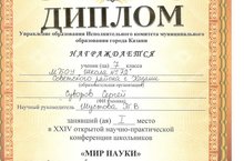 В школе №23 Ново-Савиновского района г.Казани прошла II Республиканская научно-практическая конференция учащихся им. Д.В.Вилькеева. Кириченко Александра, ученица 8А класса школы №72, заняла 2 место (секция «Русская филология», учитель Бикмаев А.И.). Поздравляем Сашу и желаем дальнейших успехов на конференциях!