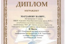В секции «Общая экология» призёром (2 место) стала ученица 11А класса Марданова Назира и призёром (3 место) стал ученик 9Б класса Марданов Амир.