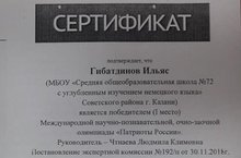 Поздравляем Гибатдинова Ильяса, занявшего I место в Международной научно-познавательной, очно-заочной олимпиаде «Патриоты России». Руководитель – Чтаева Л.К. Желаем новых побед!