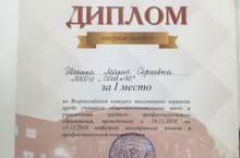 Поздравляем Шашину Марию, ученицу 10 класса, занявшую 1 место во всероссийском конкурсе письменного перевода среди учащихся школ и учреждений среднего профессионального образования. Конкурс проводился кафедрой иностранных языков в профессиональной коммуникации Казанского федерального университета. Учитель Новикова Ксения Андреевна.