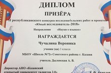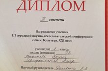 Поздравляем Хусаинову Азалию и Ярмухаметова Амира, учеников 8 класса, получивших диплом III степени на III городской научно-исследовательской конференция «Язык. Культура. ХХI век». Научный руководитель – Дылевская А.В., учитель немецкого языка. Желаем новых побед и достижений!