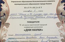 2 марта 2018 года в Лицее №131 состоялась V городская научно-практическая конференция школьников "Дни науки". Конференция призвана активизировать работу по пропаганде научных знаний, профессиональной ориентации и привлечению учащихся к научному творчеству и исследовательской работе во внеурочное время под руководством педагогов. Учащиеся нашей школы приняли активное участие в данной конференции. Поздравляем Каримова Султана и Мишина Александра, учеников 8 класса, ставших победителями в секции "Иностранные языки" (учитель Дылевская А.В.). Поздравляем Ахтямову Саиду, ученицу 11 класса, ставшую победителем в секции "Иностранные языки" (учитель Новикова К.А.). Поздравляем Сафину Сабину и Марданову Назиру, учениц 10 класса, ставших призерами в секции "Экология".