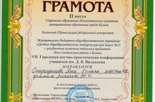 Спиридонова Яна, ученица 8А класса, призёр VII Городской научно-практической конференции учащихся им. Д.В.Вилькеева. 16.03.2016