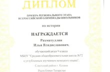 26-27 января 2016 года прошёл региональный этап всероссийской олимпиады школьников по истории. Рахматуллин Илья, ученик 9 класса, стал призёром данной олимпиады. Поздравляем и желаем дальнейших успехов!