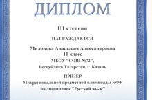 Успешное участие Милоновой Анастасии в межрегиональной предметной олимпиаде КФУ по дисциплинам «Русский язык» и «Литература»! 20.04.2015