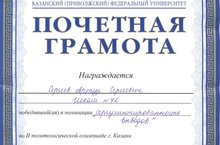Поздравляем ученика 10Б класса Сергеева Артура, победившего во II политологической олимпиаде школьников города Казани (номинация "Аргументированность выводов"). Олимпиаду проводил Институт социально-философских наук и массовых коммуникаций Казанского федерального университета.