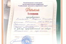 Победа ученицы 10А класса Бикбаевой Мадины на республиканской конференции "Глобализация - реальность современного мира!" 10.04.2015