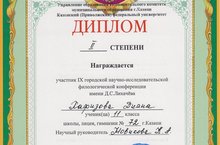 Ученики нашей школы 14 марта 2015 года приняли участие в IX городской научно-исследовательской филологической конференции имени Д.С.Лихачёва, которая ежегодно проходит в гимназии №7 г.Казани. Ученица 11 класса Хафизова Диана заняла 2 место (учитель Новикова К.А.), ученицы 9 класса Хасанова Рузалия и Хамидуллина Алсу заняли 3 место (учитель Цыганова Л.Ф.), ученица 4 класса Кудряшова Татьяна заняла 3 место (учитель Измайлова М.Н.). Поздравляем с успешным выступлением и желаем дальнейших успехов!