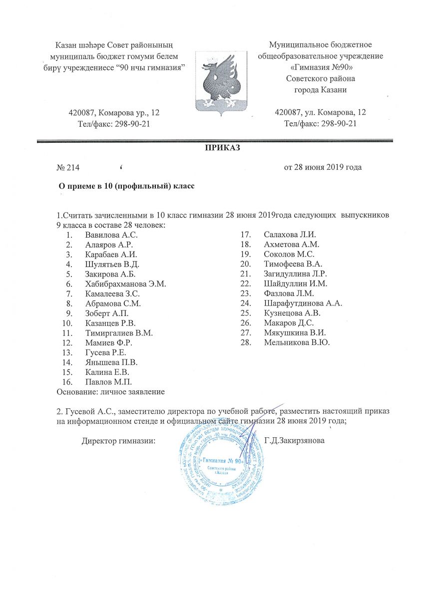 Приказ МБОУ "Гимназия №90" №214 от 28 июня 2019 года "О зачислении в 10 (профильный) класс"