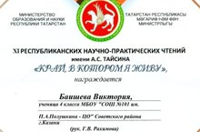 Поздравляем Баишеву Викторию, ученицу 4в класса, занявшую 2 место в ХI Республиканских научно-практических чтениях имени А.С. Тайсина "Край, в котором я живу". Благодарим классного руководителя Рахимову Гульгену Вадутовну за подготовку призёра чтений! Молодцы!
