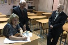 После праздничного концерта в кабинет №26 заглянули Леонид Михайлович Клейнерман, Юрий Андреевич Антонов, Юрий Викторович Строителев, выпускники 1954 года.