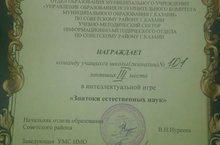 Сегодня команда школы №101 в количестве 6 человек, а именно: Сираев Б., Евлампиев Н., Булатова К., Тухватуллин А., Дербенев К., Маслов И., приняли участие в финальном туре районной интеллектуальной игры "Знатоки естественных наук", которая состоялась в 159 лицее города Казани. Ребята заняли почетное третье место. Молодцы!!! Так держать!!! Желаем вам дальнейших успехов!!!