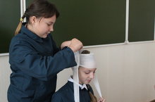 Сегодня у нас очень насыщенный день. С утра прошёл классный час «Мы вместе!». Затем тематический урок по обеспечению безопасности в отношении себя и окружающих. Мы составили схему безопасного пути в школу, научились накладывать перевязки. Тем более, что нам это очень нужно. Ведь мы поступили в профильный класс МЧС.