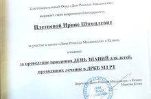 Выражаем благодарность Плетневой Ирине Шамилевне за участие в жизни ,, Дома Роналда Макдоналда” в Казани.