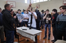 Юноши состязались в поднятии гири, в подтягивании на перекладине, в перетягивании каната. Особенно всем понравилась «сложная эстафета».