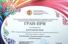 Поздравляем ученицу 8 класса Ахметзянову Энже с награждением Гран-При в номинации художественное чтение.