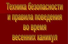 Весенние каникулы - чудесно время! Так много интересных и захватывающих дел, которыми можно заняться! Желаем Вам хорошо отдохнуть и набраться сил перед последней учебной четвертью. Чтобы не омрачать радость отдыха, не огорчать своих близких, хочу напомнить, что во время каникул не стоит забывать правила личной безопасности: