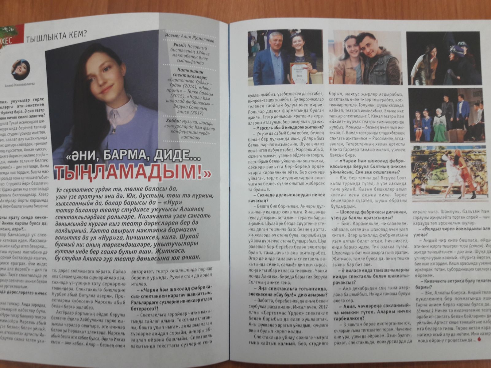 И когда в декабре, мы увидели на обложке журнала «Ялкын» ученицу нашей школы Замалиеву Алию, и статью под названием «Мама сказала мне не идти, а я не послушалась…» радости не было конца. Красивая, очень добрая, разносторонне развитая: она прекрасно читает стихи, занимается в театральной студии, кроме этого прекрасно учится – и всё это наша Алия. Успехов тебе, побед и больших свершений!!! /upload/storage/org2354/files/20181214_094642.jpg