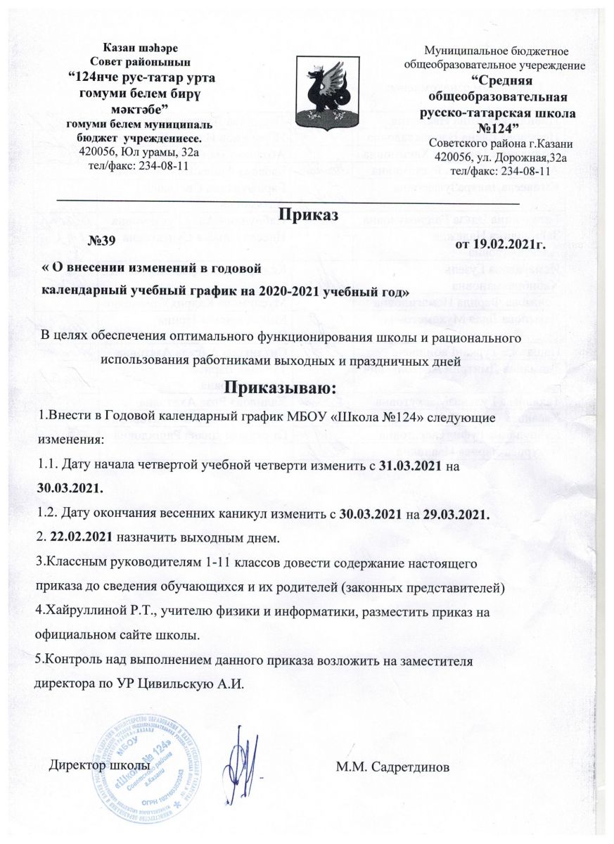 Приказ №39 " О внесении изменений в годовой календарный учебный график"