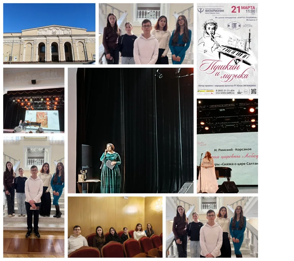 Литературно‑музыкальное путешествие: Пушкин и музыка Сегодня ученики 8 А и 8 Б классов вместе с учителем русского языка и литературы Аксановой Региной Васильевной побывали на заключительной встрече в Татарской государственной филармонии им. Г. Тукая — «Пушкин и музыка»