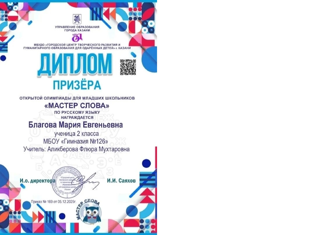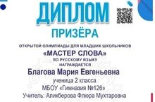 Диплом призёра открытой олимпиады для младших школьников по русскому языку «Мастер слова». Благодарим за подготовку учителя начальных классов