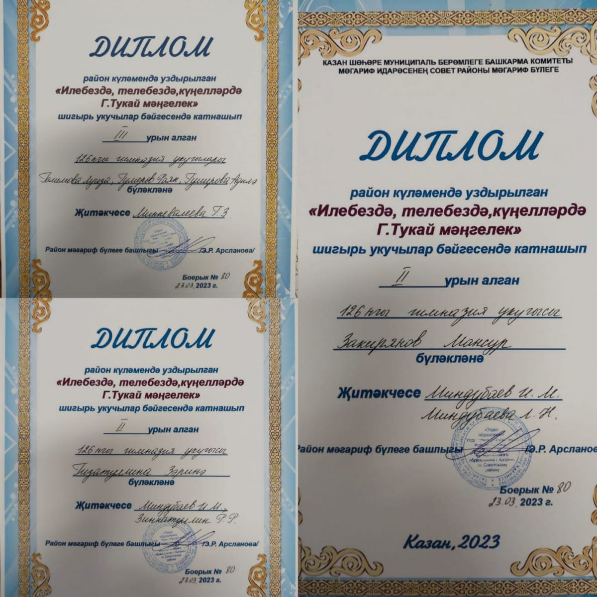 Поздравляем наших учащихся-участников районного конкурса "Илебездә, телебездә, күңелләләрдә Г.Тукай мәңгелек" Закирзянов Мансур, ученик 11 А класса - IIместо, Галимова Луиза, 4Б класс, Гумеров Раян, 4В класс, Гумирова Аделя, 2 А класс - III место, Гизатуллина Зарина, 6А класс - II место. Благодарим за подготовку учителей родного языка и литературы Зиннатуллина Разиля Ринатовича, Миндубаева Ильсура Мансуровича, Миндубаеву Лилию Наилевну, Минневалееву Гульшат Закариевну. Желаем дальнейших успехов и побед.