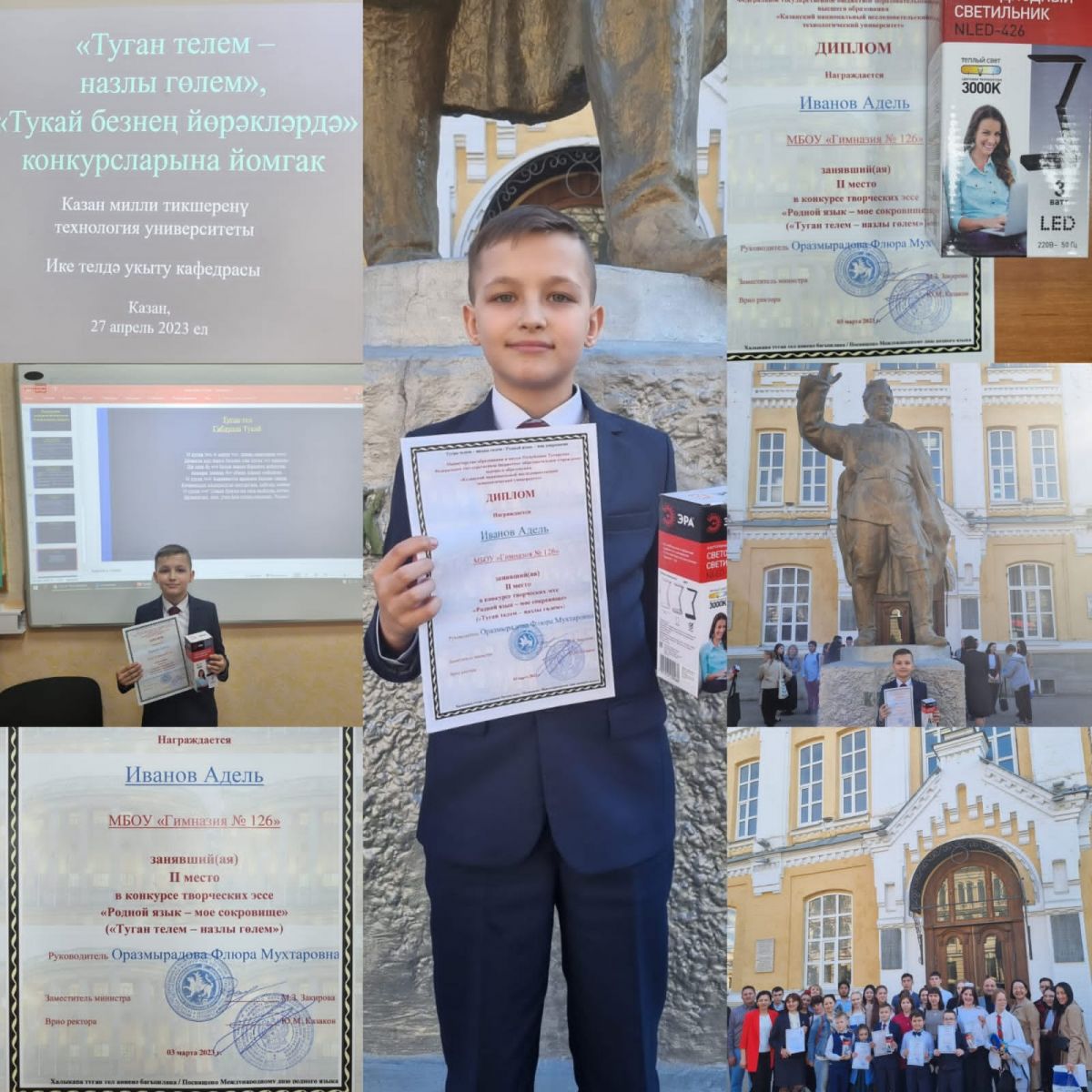 Сегодня, 27.04 в КНИТУ состоялось награждение победителей в конкурсе творческих эссе "Родной язык - моё сокровище ". Поздравляем ученика 3Б класса Иванова Аделя. Он занял II место. Благодарим за подготовку учителя начальных классов Оразмырадову Флюру Мухтаровну. Желаем дальнейших успехов и побед.