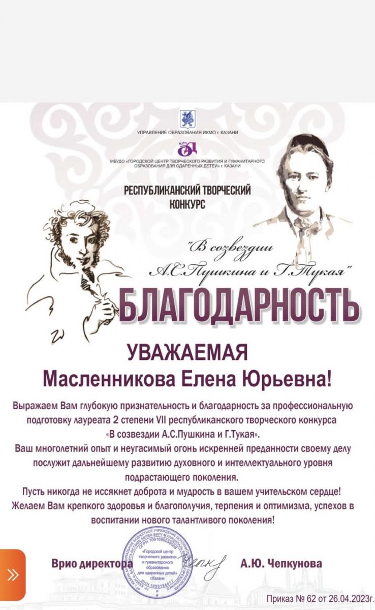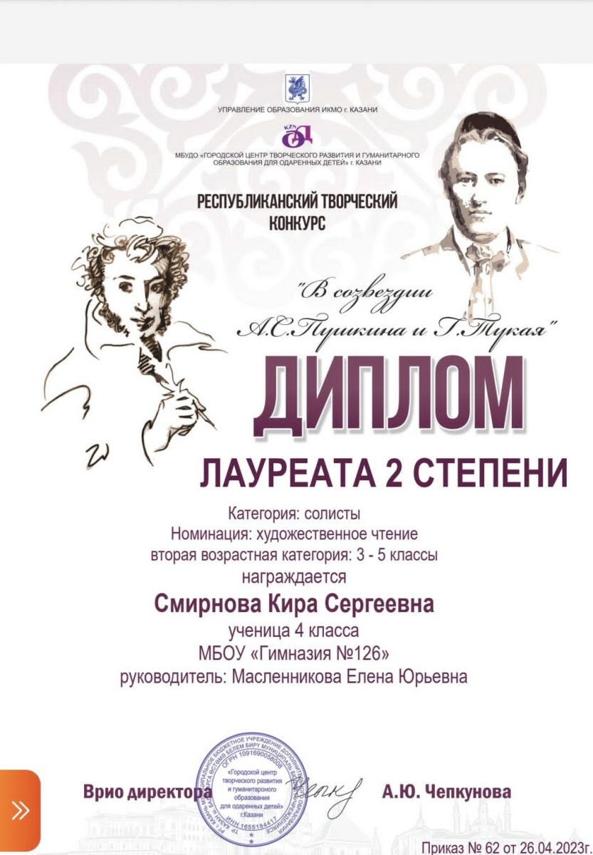 Поздравляем ученицу 4 Б класса, Смирнову Киру, Диплом II степени в республиканском конкурсе "В созвездии А. С. Пушкина и Г. Тукая". Благодарим за подготовку учителя начальных Масленникову Елену Юрьевну. Желаем дальнейших успехов и побед.