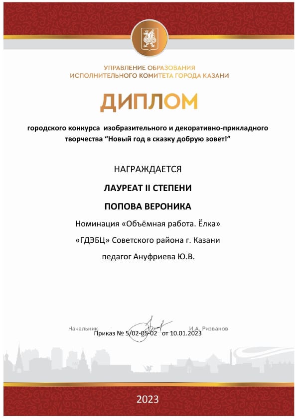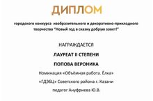 Поздравляем ученицу 8 А класса, Попову Веронику с победой! Диплом II степени в городском конкурсе изобразительного и декоративно-прикладного творчества "Новый год в сказку добрую зовёт! " Благодарим за подготовку педагога ГДЭБЦ, Ануфриеву Юлию Владимировну. Желаем дальнейших творческих успехов и новых побед.