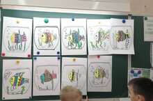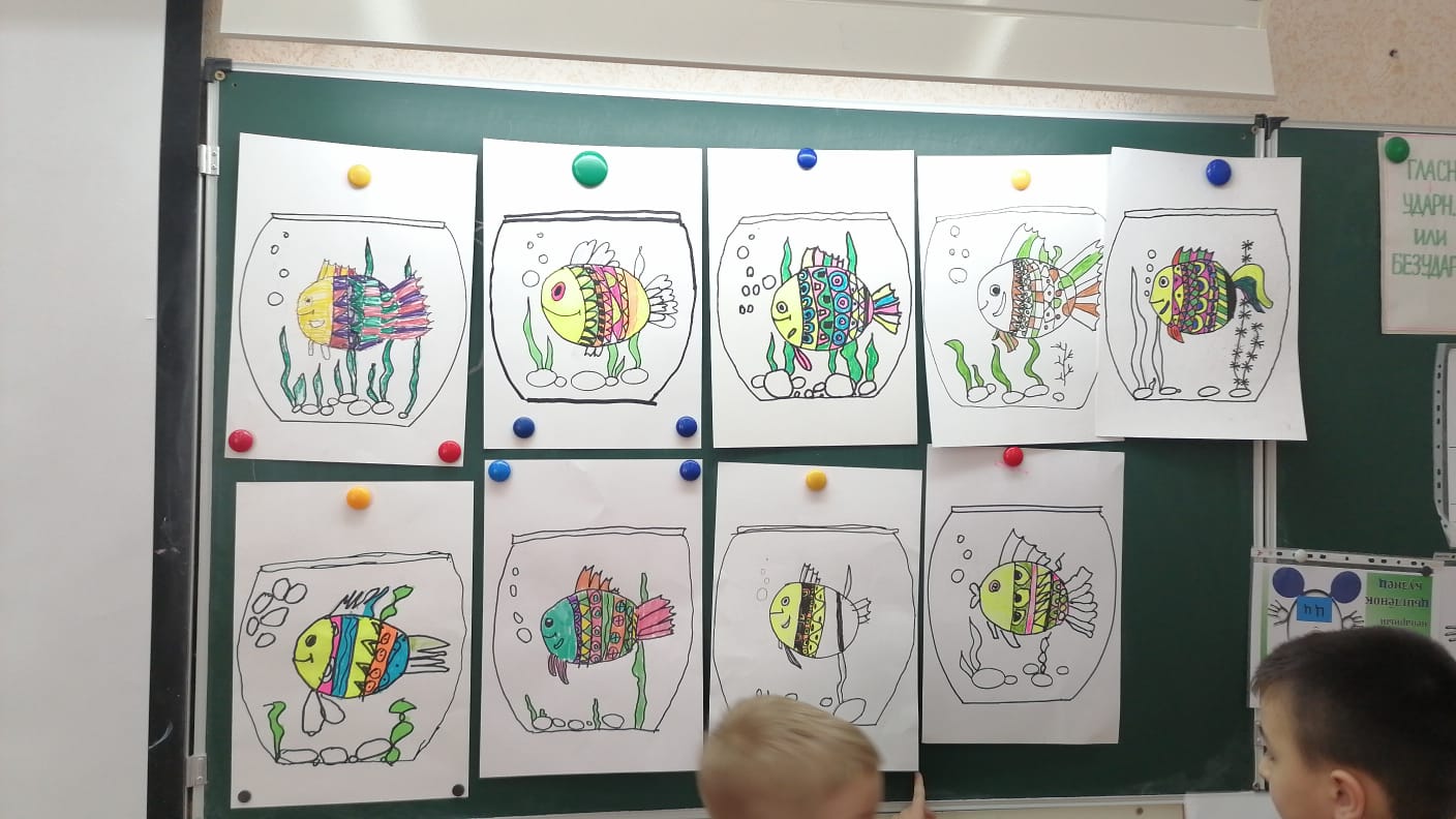 Ученики 1 А класса на занятиях в Аrt - студии. Маленьким художникам предстоит нарисовать аквариум с водой, в которой плавает рыбка. В этом изображении есть мелкие детали и области, которые не должны пересекаться. А это будет отличная тренировка мелкой моторики.
