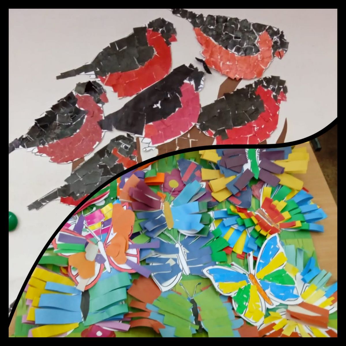Учащиеся 1 А класса, классный руководитель Сайфутдинова Рушания Габдурахмановна в группе продленного дня занимаются аппликацией. Благодаря развитию аппликацией дети учатся узнавать цвета и фигуры. Становятся более аккуратными, внимательными, точными. Дети познают окружающий мир, развивают творческий подход, мелкую моторику рук. Цветная бумага в руках первоклассников превращается в красногрудых снегирей и в разноцветных бабочек.