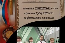 Поздравляем ученицу 4Б класса, Смирнову Киру. К своим увелечениям музыкой, конферансом, рисованием, Кира добавила фехтование на шпагах. И получила 3 место в Зимнем Кубке РСШОР. Поздравляем и желаем дальнейших творческих и спортивных достижений.