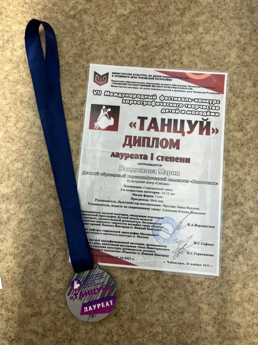 Поздравляем с победой ученицу 4 А класса Вандюкову Марию, она - Лауреат I степени и участница VII Международного фестиваля-конкурса хореографического творчества детей и молодежи "ТАНЦУЙ", который проходил в г. Чебоксары. Она представила свою сольную программу "МОЙ МИР". Благодарим за подготовку руководителей: Фролову Лиану Фановну, Алексееву Ксению Денисовну. Желаем дальнейших успехов и творческих побед.