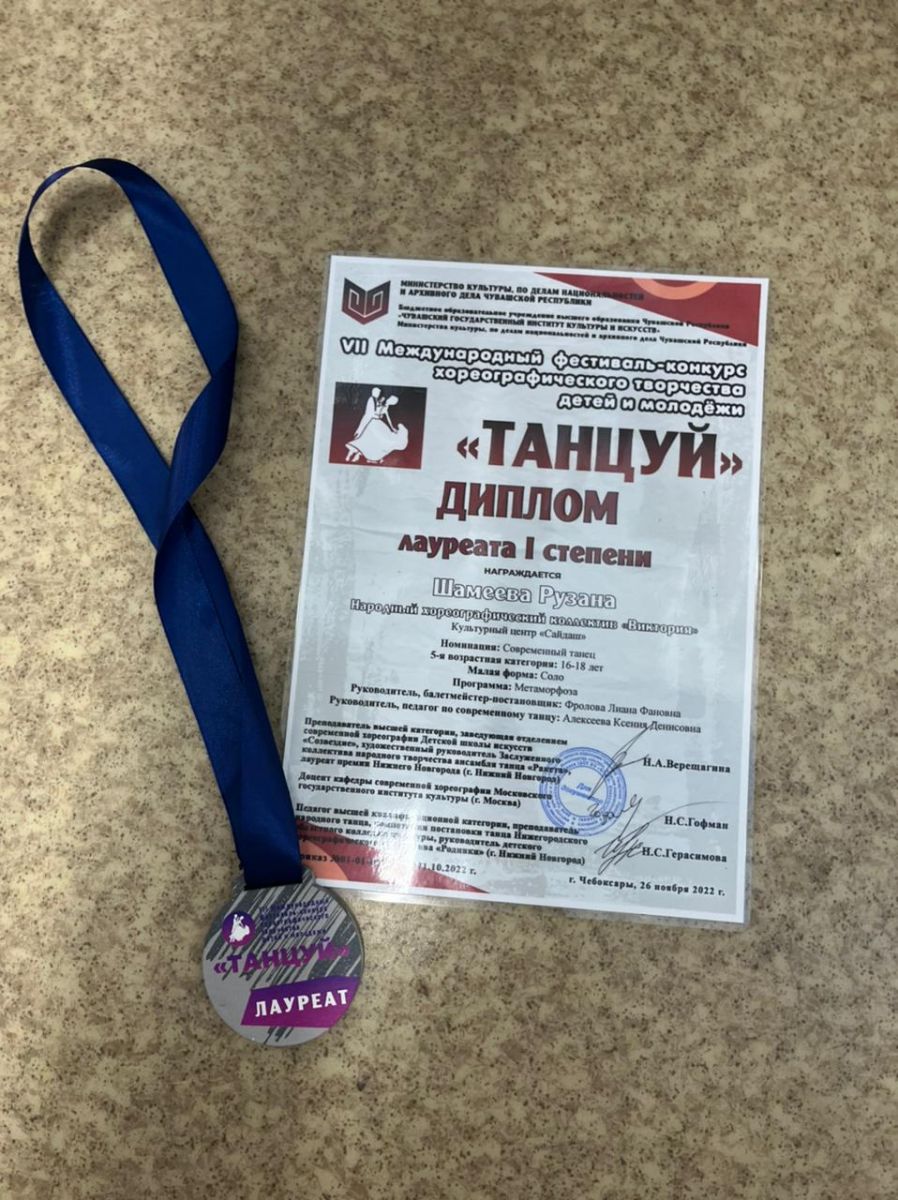 Поздравляем с победой ученицу 10 А класса Шамееву Рузану, она - Лауреат I степени и участница VII Международного фестиваля-конкурса хореографического творчества детей и молодежи "ТАНЦУЙ", который проходил в г. Чебоксары. Рузана представила на конкурсе свою сольную программу "МЕТАМОРФОЗА". Благодарим за подготовку руководителей: Фролову Лиану Фановну, Алексееву Ксению Денисовну. Желаем дальнейших успехов и творческих побед.