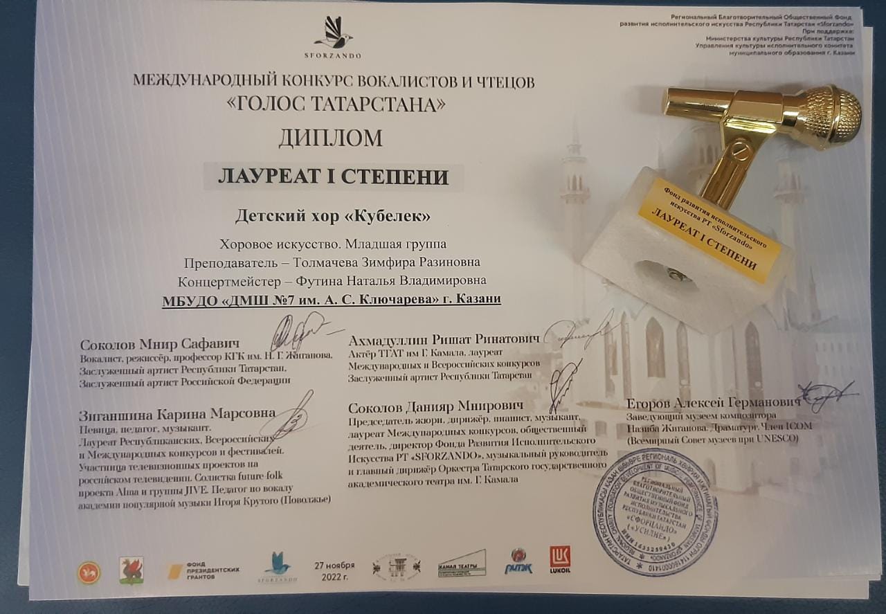 Поздравляем Детский хор "Кубелек" с победой. Коллектив - Лауреаты I степени. Приняли участие в Международном конкурсе вокалистов и чтецов "Голоса России". Солист хора, ученик 3 Б класса, Майоров Назар. Благодарим за подготовку преподавателей ДМШ №7 Толмачеву Земфиру Разиновну, Футину Наталью Владимировну. Желаем дальнейших успехов и побед.