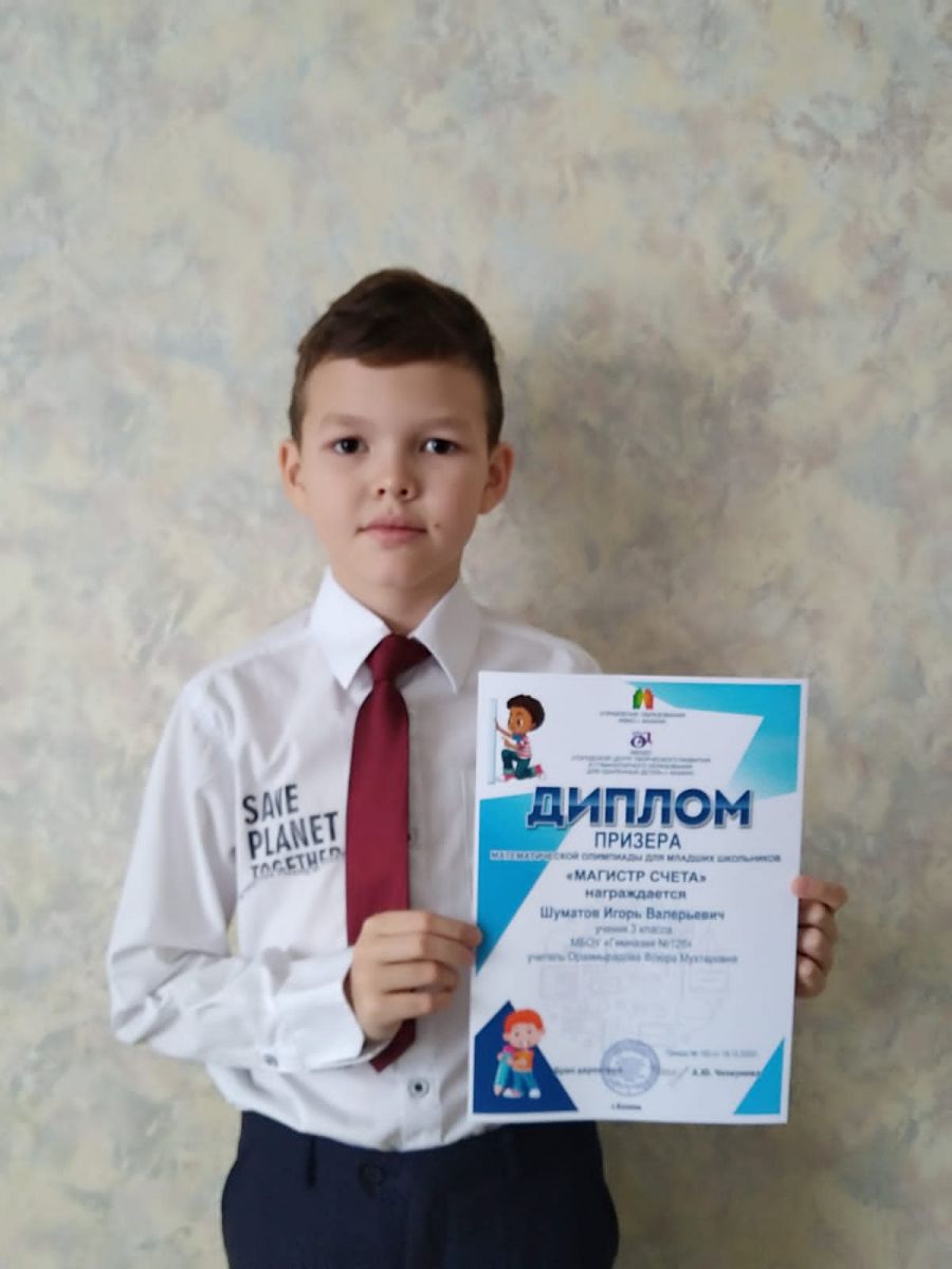 Поздравляем ученика 3 Б класса, Шуматова Игоря. Благодарим за подготовку учителя начальных классов Оразмырадову Флюру Мухтаровну. Желаем дальнейших побед.