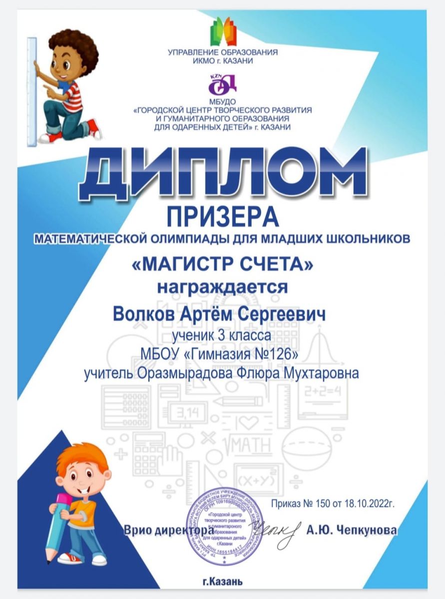 Поздравляем ученика 3Б класса, Волкова Артёма. Он - призёр математической олимпиады для младших школьников. Благодарим за подготовку учителя начальной школы, Оразмырадову Флеру Мухтаровну. Желаем дальнейших успехов и побед.