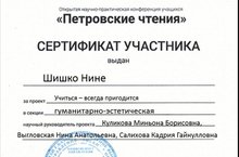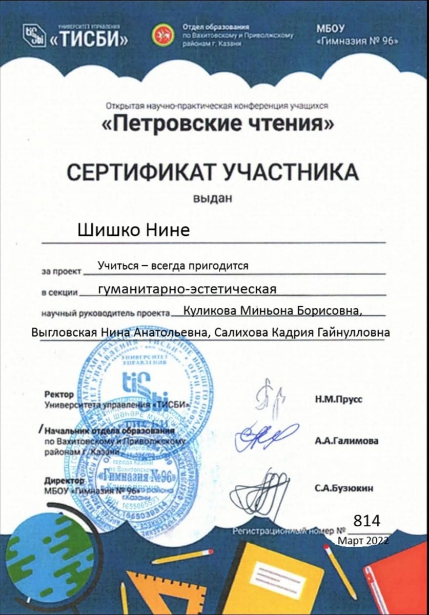 Поздравляем ученицу 1 А класса Шишко Нину. Она участница Республиканской научно-практической конференции "Петровские чтения". Благодарим за подготовку Салихову Кадрию Гайнулловну, учителя начальных классов, Выгловскую Нину Анатольевну, заведующую библиотекой, Куликову Миньону Борисовну, учителя музыки.