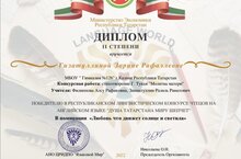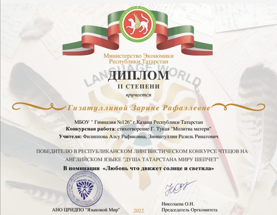 Поздравляем ученицу 5 А класса Гизатуллину Зарину с победой. Диплом II степени. Благодарим за подготовку учителя татарского языка и литературы Зиннатуллина Разиля Ринатовича, учитетеля английского языка Филиппову Алсу Рафиковну. Желаем дальнейших побед.