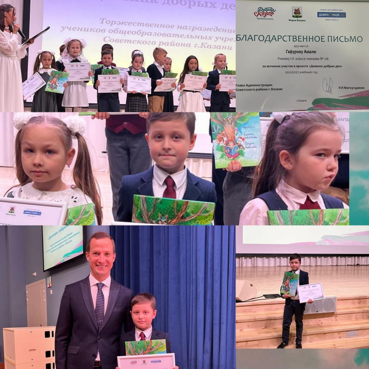 «Дневник добрых дел» — значимый воспитательно-образовательный проект Казани, реализуемый с 2016 года. Неотрывно от печатного издания существует портал дневникдобрыхдел.рф. На нем школьники могут записывать совершенные добрые дела, делиться новостями и впечатлениями, участвовать в конкурсах. Когда делаешь добро, на душе становится очень весело и хорошо. Если делать людям что-то хорошее, то и им захочется поступать также. Спеши творить добро и жизнь вокруг станет светлее, добрее и радостнее! Сегодня состоялось торжественное награждение учеников образовательных учреждений Советского района г. Казани. Нашу гимназию представил ученик 1А класса Гафуров Амаль. Глава Советского района Фатхутдинов Роман Рамизович вручил ему Благодарственное письмо и пожелал дальнейших успехов. Поздравляем Амаля и желаем всегда совершать только добрые дела.