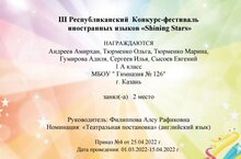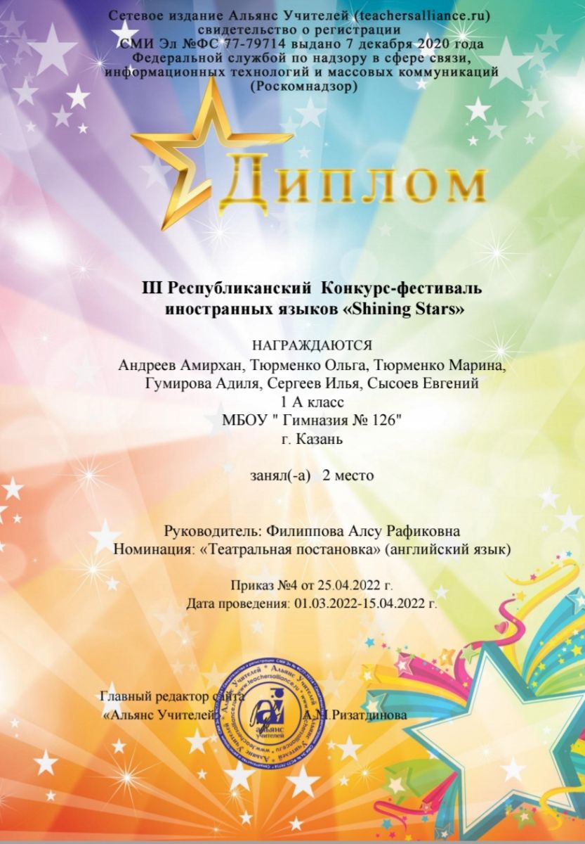Поздравляем наших учеников 1 А класса, Тюрменко Олю, Тюрменко Марину, Гумирову Аделю, Сысоева Евгения, Андреева Амирхана, Сергеева Илью. Они участники и победители III Республиканского Конкурса-фестиваля "Shining Stars"-Диплом 2 место в номинации "Театральная постановка" (английский язык). Благодарим за подготовку учителя английского языка Филиппову Алсу Рафиковну. Желаем дальнейших успехов и творческих побед.