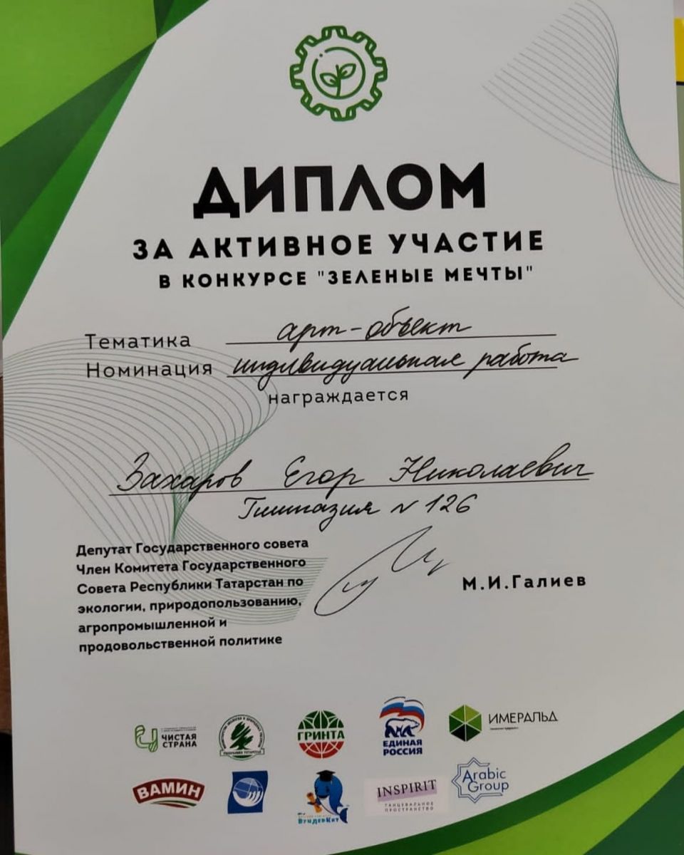 Поздравляем Захарова Егора, ученика 8А класса за активное участие в конкурсе "Зелёные мечты"